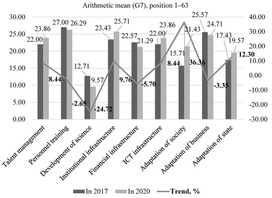 Data from Table 7 indicate dynamic changes in the values of indicators and their variations at the growth poles of the world economy throughout the entire period under consideration. To clarify the results obtained, we conducted an in-depth analysis in the dynamics of 2017–2020. Survival trends for G7 states under the influence of digitalization are determined in Figure 1 with the help of the trend analysis of the change of the digital competitiveness indicators for 2020 (from Table 2) as compared to their values in 2017 (from Table 1).