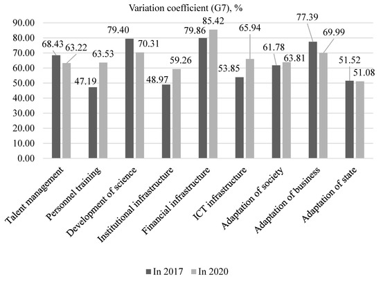 In G7 countries, a positive tendency is the growth of development of science by 24.72% in 2020 as compared to 2017. This led to an increase in the level of adaptation of business to digitalization by 3.35%. A barrier on the path of achievement of larger results in G7 countries is a high variation of the activity of applying the perspective mechanisms of adaptation to the risks of digitalization: 63.22% for talent management and 70.31% for the development of science.