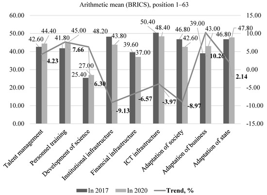 Survival trends for BRICS countries under the influence of digitalization are determined in Figure 3 with the help of the trend analysis of the change of the digital competitiveness indicators for 2020 (from Table 2) as compared to their values in 2017 (from Table 3).
