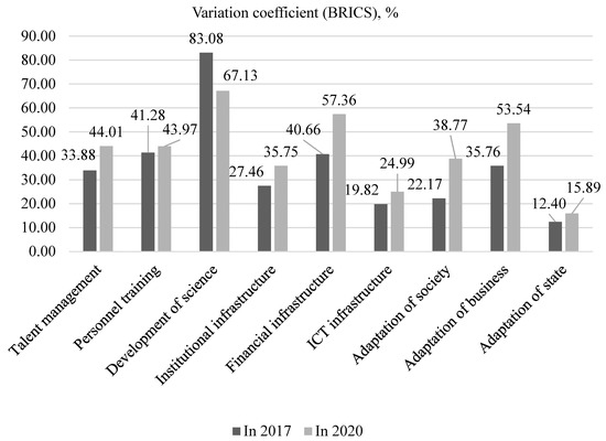 To determine the level of coverage of BRICS countries by the determining tendencies, let us use the results of the variation analysis, which reflects the homogeneity of the sample of countries in 2017 and 2020 (Figure 4).