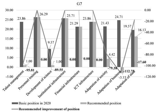 As shown in Figure 5, the future perspectives of adaptation to the digitalization of G7 countries are connected to the increase of the level of society’s adaptation by 79.38% (improvement of their average position in the ranking from 21.43rd to 4.42nd position), the increase of the level of adaptation of business by 112.72% (improvement of their average position in the ranking from 24.71st to 1st position), and the increase of the level of states’ adaptation by 17.60% (improvement of their average position in the ranking from 19.57th position to 16.13th position). The positions are places (from 1st to 63rd) in ranking. Indicated in Figure 5, the optimal values of the variables of models 1–3 were obtained using the least squares method. Factors adaptation to the risks of digitalization that are ineffective in the G7 countries (from Table 11) are not involved in optimization—they retain the values of 2020 (zero growth in Figure 5). Figure 5 reflects the Pareto-optimal combination of variables, at which the potential of adaptation of the G7 countries to digitalization is most fully revealed.