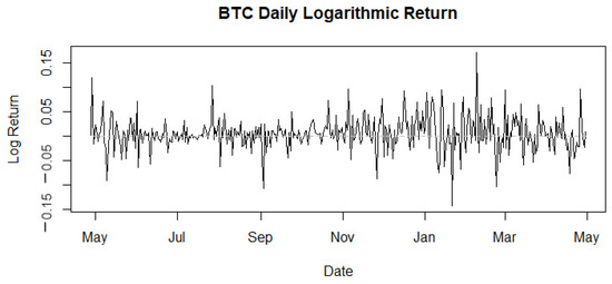 Second, the daily logarithmic return of BTC is calculated. It can be expressed by