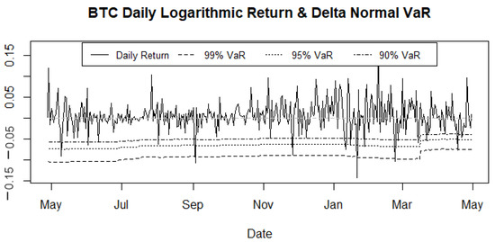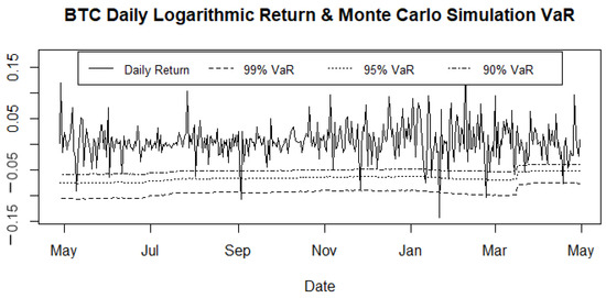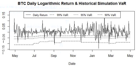 First, we show the noise of the daily log-return of BTC, which is compared with lines of daily historical simulation VaR value in Figure 3. The interpretation of this figure is that if the noise is over the reference VaR line, it means those days have losses over the VaR model, and it is counted to be the number of extreme losses or the realized number of exceptions that occur. These results will be used to be a parameter for Kupiec’s POF test in Table 2.