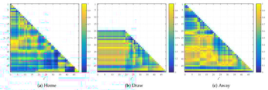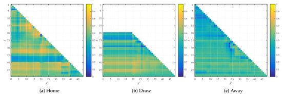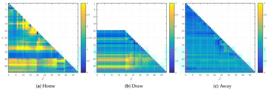 Following the above trading strategy, we can compute the resulting trading profit for each time pair and each market—home win, draw and away win. Without the loss of generality, we set the initial bankroll to . The quoted probability is represented by and the alternative probabilistic view based on the regression analysis on two regressors is represented by . We apply it to the testing part of the data set of the remaining 100 games. While the trading results in the likelihood ratio statistics, these results’ statistical significance is not immediately apparent as the quoted probabilities are not identically distributed. The test’s powers can be simulated from bootstrapping, but this is outside of the scope of our paper. Obviously, the terminal wealth (likelihood ratio) above 1 corresponds to trading profits and below 1 to trading losses. Visually, Figure 4 shows the realized profit of regression models when trading against the quoted probabilities. The yellow color represents profits and blue color represents losses. Similarly, Figure 5 represents trading profits and losses based on the spatial stopping time strategy.