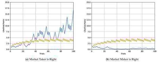 which is just a scaled likelihood ratio from Equation (19). We have one to one correspondence if the starting capital of a market taker is set in the situation of the market taker and a market maker as described in the previous section and if we set in the situation of two market takers. The Bayes factor transforms this problem back to the likelihood ratio, assuming that the measure plays the role of a market maker. The inverse of the Bayes factor, , would reverse the role of the market maker and the market taker, this time the measure would be the market maker.