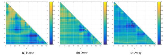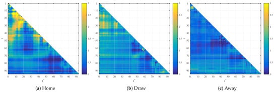Figure 1 visualizes the results of the regression analysis. The graphs represent the p-value of the second regression coefficient in home, draw and away betting markets. Every colored point represents the p-value of a different regression and is the combination of at time t on the y-axis and at time s on the x-axis. Yellow color represents p-values close to 100% and blue color represents p-values close to 0%.