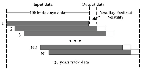 The output of the GARCH process is paired with the historical volatility data forming the input of the LSTM NN, as illustrated in Figure 3. The training set for the LSTM model is constructed in a specific way. More precisely and different from other NN applications, the construction of the training dataset for time series forecast requires the choice of a lag parameter, which directly affects the predictive performance. The key idea is to overlap rolling windows with a fixed length (the so-called lag parameter) that in our simulation we set equal to 100 days. Each of these input sequential data produces a volatility forecast for the next day, as shown in Figure 4.