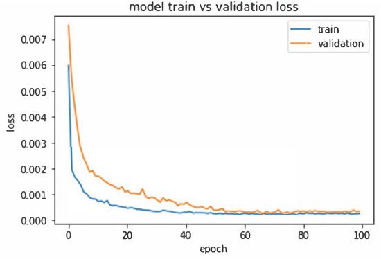 We compare the predicted and the actual volatility , which corresponds to the target value of the learning process. We present training and validation errors in Figure 6, in terms of MSE, i.e., Mean Squared Error, obtaining an error of after 100 epochs.
