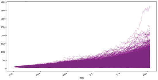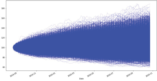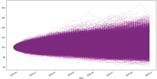 We consider simulations that model a portfolio following a Black–Scholes equation such as Equation (11), which describes a geometric Brownian motion. We compute the average return (considering a drawdown plan of for each year) and develop 10,000 different scenarios for each configuration, using a Jupyter Notebook for the numerical simulation.