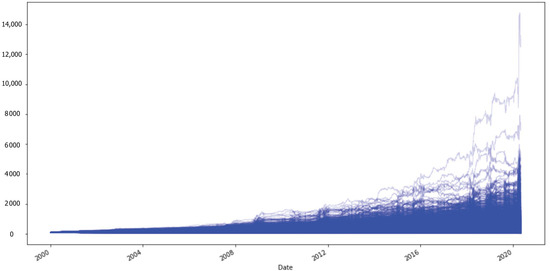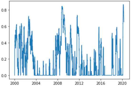 Starting from the time series of the S&P500 for the period 2000–2020 with daily data points, the realized historical volatility of the S&P500 returns were determined on a monthly basis. Historical volatility was computed as the standard deviation of the difference of the logarithmic returns considering a temporal window of 21 business days, according to Equation (2). It is expressed in annualized terms (multiplied by the square root of 252), which allows for comparisons between daily, weekly, and monthly volatility calculations. Nevertheless, we often observe that daily volatilities are greater than weekly volatilities, and weekly volatilities are greater than monthly volatilities. We chose to consider monthly stock volatility in order to reduce the effect of day-by-day price fluctuations.