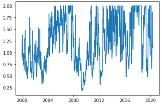 Volatility output from the GARCH(1,1) process for the period from January 2000 to January 2020. The parameter is equal to ; is equal to ; and is equal to (source: authors’ calculations).