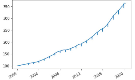 In Figure 18, we report the evolution for the averaged return of the corresponding VolTarget portfolios starting January 2000 and with the same initial investment, i.e., 100 euros.