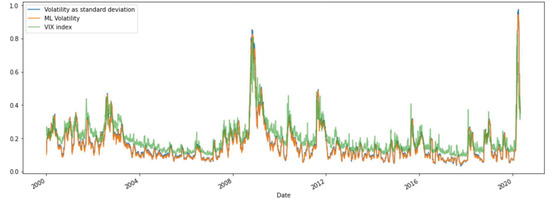Volatility estimates computed according to three different models: historical realized volatility, predicted ML volatility and the VIXindex (source: authors’ calculations).