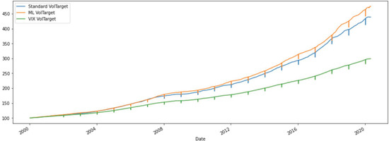 Figure 17 reports a modified version of Figure 5, showing volatility inputs for the three VolTarget strategies. We also added the VIXindex CBOE (2019), tge real-time market index representing the market’s expectations for volatility of the S&P500 index over the coming 30 days Cao et al. (2020), as a reference for comparison purposes. The VIX index is clearly higher since it is calculated as the 30 day expectation of volatility. We recall that realized volatility is, instead, computed as the standard deviation over 21 days.