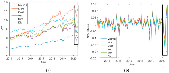 Figure 1 shows NAV values and time series of returns for all the smart beta considered, black rectangles highlight the COVID-19 period (January 2020–May 2020). From Figure 1a, note that NAV values start to sizably decrease in December 2019, and curves in Figure 1b show that the returns are characterized by a strong drop and then by a recovery during the COVID period. In order to investigate the existence of a correlation between multi-factor portfolio strategies and economic trends, the monthly macroeconomic time series are:
