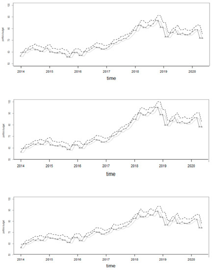 - , where ν is an arbitrary coefficient indicating the percentage of loss that would induce the manager to liquidate the portfolio and invest in a new portfolio obtained by solving problem (2)–(4). The quantity ν in this analysis is equal to 0.01. As in the case of γ, a higher value of ν highlights a greater willingness of investors to suffer losses and wait for the weights to be updated. In contrast to the previous case, loss is capitalized and the portfolio weight is updated.