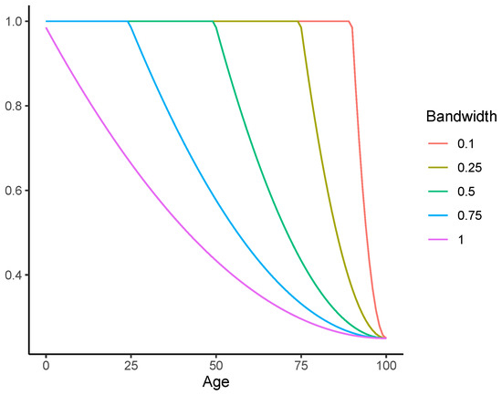 To deal with the first challenge, in this paper we use the inverse Epanechnikov kernel evaluated at the last observation to characterize the parametric structure of . Inverse Epanechnikov kernel is a parsimonious approach to construct smooth functions. More specifically, let be the scaled index with , the (adjusted) inverse Epanechnikov kernel evaluated at N is determined by with . The parameter b, ranging from 0 to 1, is the bandwidth of the inverse Epanechnikov kernel. For example, consider ages 0–100, the inverse Epanechnikov kernels evaluated at age 100 is displayed in Figure 1 for 0.1, 0.25, 0.5, 0.75 and 1. We see that the estimated kernel is constant for all ages up to a “cut-off” age, and then become decreasing afterwards. Specifically, the cut-off age is determined by the bandwidth parameter b. For example, if , then the cut-off is the 90% percentile of all ages considered. In other words, the kernel will be constant for the first 90% of ages. On other other hand, when , the cut-off age is the first age in the sample, and thus the kernel will be decreasing over the whole age group. Finally, the kernel will converge to 0.25, regardless the value of b. Therefore, the inverse Epanechnikov kernel provides a convenient tool to specify the smooth parametric structures of .