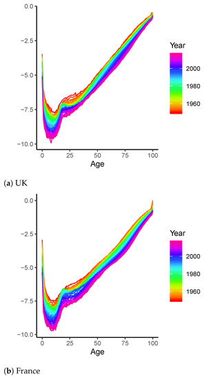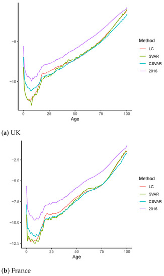 We now investigate the multi-population case by modelling the UK and French data jointly. As discussed at the end of Section 3.2, we consider the situations of a uniform penalty term (CSVAR) and individual penalty terms (CSVAR). The selected tuning parameters of the SVAR and the two CSVAR models are reported in Appendix A. The results of are summarised in Table 3, where the Li–Lee model is fitted to replace the Lee–Carter model for comparison. The following observations can be made. First, by jointly modelling the UK and French data, the forecasting results of the Li–Lee model are considerably improved over those of the Lee–Carter model displayed in Table 1. This, however, is not the case for SVAR and CSVAR. Although their performances are comparatively better than those of the Li–Lee model for both populations, the forecasting results of the CSVAR model and the SVAR model are less accurate than those of the single-population counterparts. For instance, the of the CSVAR model increase from 0.1106 and 0.1358 to 0.1159 and 0.1396 for UK and French data, respectively. One possible reason of the reduced accuracy in the two-population case is that the VAR model may produce less accurate forecasts when more irrelevant information is included (Feng and Shi 2018). Therefore, the application of a uniform penalty term may lead to the estimated and that poorly reflect the historical mortality pattern of both populations. In contrast, when different penalty terms are allowed, the forecasting results of CSVAR are almost uniformly better than those of the Li–Lee, SVAR, and CSVAR model. Furthermore, compared to the single-population forecasts, CSVAR leads to 23% improvement over the single-population CSVAR model of the French data ( of 0.1046 vs 0.1358). As for the UK data, the forecasts of CSVAR are almost identical to those of the single-population CSVAR model. This may suggest that the UK mortality improvements may provide additional important information in the projection of the French improvements, but not vice versa.