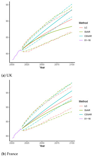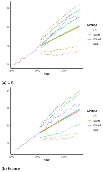 In the empirical analysis, the proposed CSVAR model is illustrated using the single-age, uni-sex mortality data of the UK and France in both the single-population and multi-population context. We find that, due to the age-coherent feature, the CSVAR model generates smoother long-term projection of age-specific mortality rates. In particular, the projected mortality improvements are more similar across ages—they are more pronounced for the old ages and less substantial for the very young ages compared to those produced by the Lee–Carter model and the SVAR model. As a result, the proposed CSVAR generates higher point forecasts of life expectancy at birth than the Lee–Carter model and the STAR model at all forecast horizons. Moreover, in the out-of-sample forecast analysis, the proposed CSVAR model is able to produce more accurate out-of-sample forecasting results than the Lee–Carter model (and the Li–Lee model in the multi-population case) and the SVAR model with different choices of sample size and age groups. Furthermore, the proposed CSVAR model produces projected life expectancy closer to the realized values over the out-of-sample forecast period in both populations than the Lee–Carter model and the STAR model. Therefore, it seems that the proposed CSVAR model is able to generate both the long-term forecasts and the short-term out-of-sample forecasts, and could therefore be a appealing alternative to the existing models in life insurance and demographic analysis.