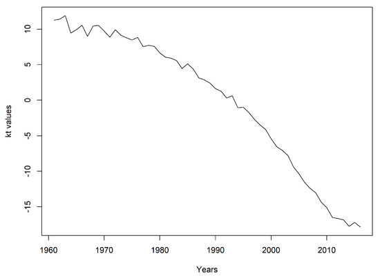 where denotes average age and is the average value of . and are two stochastic processes, which represent the two time indices of the model. Time index reflects the level of mortality measured at time t, while shows the slope and affects every age differently. The parameter represents the cohort effect. Li et al. (2015) considered three different approaches, which were presented in the work of Zhou et al. (2014) to forecast future mortality rates.