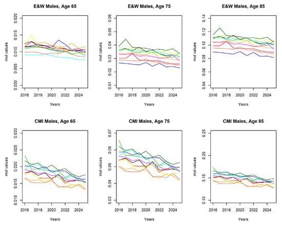 - We generate future mortality rate samples for all x and future t with the incorporation of the parameters obtained in Step (2) and the simulated values that we gained in Step (3) into and . As a result, our set of future mortality rates will form one random future scenario.