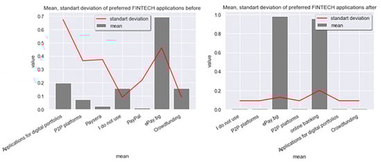 Of interest are the preferences related to the use of the FINTECH applications studied in the survey regarding the circumstances before and after the crisis of COVID-19 (Figure 2). Due to that reason, we included the following two questions in the questionnaire survey—“Which FINTECH tools did you use before the COVID-19 crisis?”, “Which of the FINTECH tools would you use after the COVID-19 crisis?”—as more than one answer was possible.