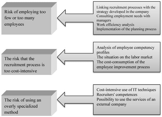 The above-mentioned conditions and a dynamically changing situation in the labor market brings about the necessity to pay attention to the procedures that enable the acquisition of adequate employees for the offered positions. In particular, procedures related to recruitment (the risk related to human resource management appears in the international literature both in the form of theoretical considerations and conducted research (Anaraki-Ardakani and Ganjalim 2014; Nickson 2001; Meyer et al. 2011; Shriram 2017, p. 3) The risk related to recruitment has been determined to be an important element of the human resource management process) should not be done by trial and error, but instead should be a coherent action system oriented towards achieving the main objective, which is usually hiring the person with the most appropriate qualifications and personality, who can fit into the organization (Borowski 2016).