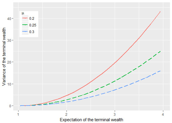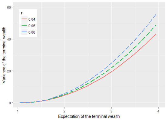 Figure 2 shows how the return rate of the stock influences the efficient frontier. Higher level of the return rate of the stock price lowers the variance of terminal wealth with the same , which is quite clear due to the fact that the investor receives more risk premium as increases and the investor can therefore undertake less risk by investing less into the stock and more into the risk-free asset so as to have the same expected terminal wealth.