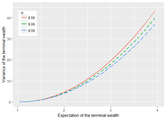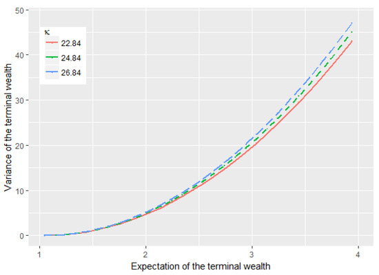 The effect of the parameter on the efficient frontier is given in Figure 4, which shows that decreases with the same as increases. Again, from the proof of Lemma 3 above, we see that plays a role as the volatility of the reciprocal of volatility process , and a larger results in milder movements of the volatility process . In addition, we see that the long-run level of volatility decreases as increases. Therefore, these two factors help the investor bear less risk.
