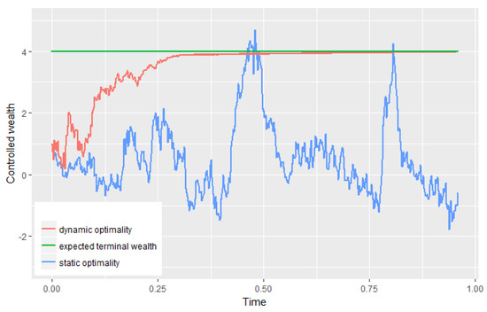 To end this section, we show the dynamics of wealth processes controlled by the statically optimal strategy (30) and the dynamically optimal strategy (33), respectively. By setting 500 equidistant time points over , we simulate two paths of optimal wealth processes and . Figure 5 illustrates the significant difference between the dynamically optimal wealth process and the statically optimal wealth process . In particular, we see that the result supports the conclusion of Theorem 2 above: the dynamically optimal wealth is strictly smaller than the expected terminal wealth when .