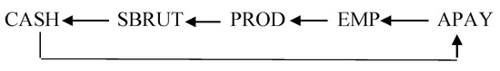 Below is the current closed cycle of relations between five interdependent variables from an econometric model of a small industrial enterprise. The below-presented mechanism of relations is similar to a recursive one. It, however, differs from recursiveness in the fact that there is neither a beginning nor an end. The following closed cycle of relations between five endogenous variables in a small enterprise will be considered: