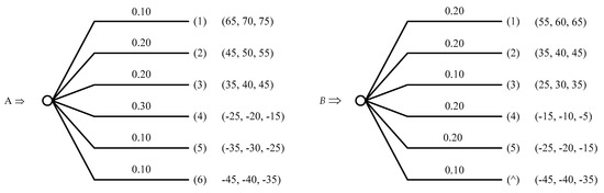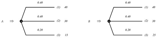 In the approach of subjectively weighted probabilities (expression (5)), the generalized utility of a prospect depends both on the estimates of the utility of its outcomes and on the weighted values of the outcomes’ probabilities. As noted earlier, probability weights reflect the individual’s subjective perception of the corresponding values of outcome probabilities. Obviously, the same values of probabilities will give the same weighted values of these probabilities for different prospects in the real prospect choosing problem. These weighted values are completely independent from the estimates of the outcomes or the estimates of the utility of the outcomes and are determined only by the values of the corresponding probabilities and the shape of the probability weighting function. Such explicit independence of the weighted values of probabilities from the prospect outcomes estimates can lead to the following problem. Let’s assume that the following two prospects are given (see Figure 1).