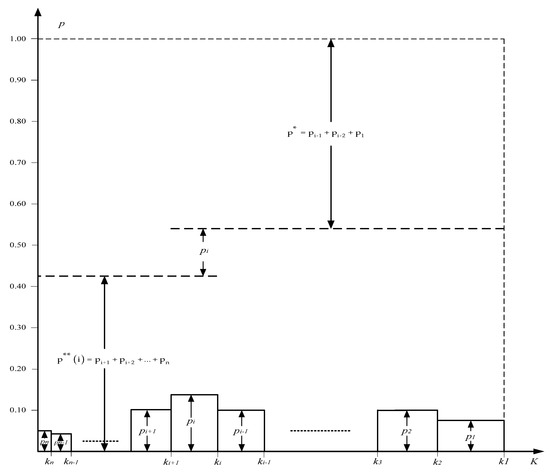 To better understand the concept of good and bad news probabilities, consider a generalized prospect . Let’s assume that the outcomes of this prospect are ordered in a descending order of their estimates: . If in the original presentation of a prospect, its outcomes are not ordered in the way presented above, this can be done without influencing subsequent conclusions. If in the original presentation of a prospect there are outcomes with the same estimates, they are combined into one outcome with the same estimate and probability of occurrence . A conditional prospect with and the probabilities of good and bad news for that perspective are graphically depicted in Figure 2.