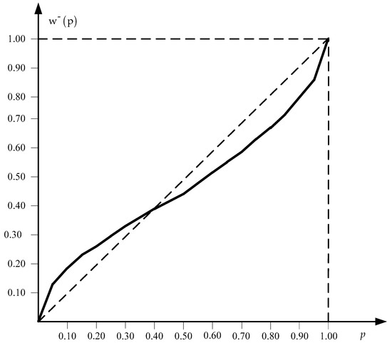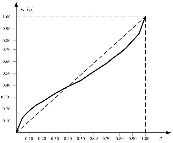 Using the probabilities’ weighting functions , , and the values of the outcomes’ probabilities, the decision weights’ values for the outcomes are calculated by the expressions: