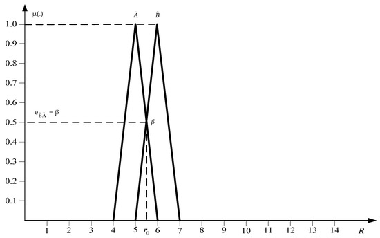 The value is defined as the value of the membership function for the point , at which the graphs of the membership functions , intersect. The number is interpreted as the degree to which is greater than (Buckley 2006, pp. 17–18). The fuzzy number is greater than the fuzzy number to the degree if