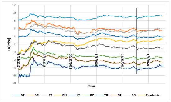 The co-movements of the 9 cryptocurrencies along the time from 13 September 2017 to 21 September 2020 are depicted in Figure 1. On the y-axis are the of the cryptocurrencies, while on the x-axis is the time. There is a vertical line on 11 March 2020, showing the declaration of COVID-19 as Pandemic by the World Health Organization (WHO). It is apparent from Figure 1 that there was a decrease in of each of the cryptocurrencies just after the declaration. However, afterward, the cryptocurrencies recovered and were back on the track.