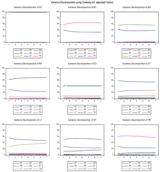 To investigate the interrelationships among the cryptocurrencies in presence of the COVID-19 pandemic, the variance decomposition of all the cryptocurrencies is depicted in Figure 2. It is evident that the variation (almost 100%) in Bitcoin is due to itself and not due to other cryptocurrencies. Furthermore, Bitcoin has a significant amount of portion of the variation in all other cryptocurrencies like BitcoinCash, Binance and Eos (almost 40%), Ripple, Stellar, and Tron (around 20%). However, for these six cryptocurrencies, the proportion of variation of Bitcoin is lesser than the cryptocurrency itself. Interestingly, for Litecoin and Ethereum the proportion of Bitcoin (almost 50%) is greater than the proportion of variation of cryptocurrency itself. All these results suggest that the variations in Bitcoin are the sole stronger driver of the variations in all other eight cryptocurrencies. The results of the variance decomposition when the COVID-19 pandemic is not considered are the same, indicating again that in the long run, there is no significant impact of the COVID-19 pandemic on cryptocurrencies and hence they are resilient.