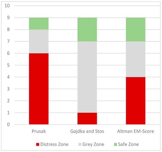 The value of the Z function for the Prusak model indicates that in the first half of 2019, six out of nine of the companies that were analyzed were at risk of bankruptcy, two were in the grey zone, and only Mex Polska SA was in a good financial situation. In the case of the Gajdka and Stos model as well as Altman’s EM-score model, seven companies were in the grey zone or were at risk of bankruptcy. On the other hand, both Gajdka and Stos and Altman’s EM-score indicate no risk of bankruptcy for CFI Holdings SA and Interferie SA. Figure 1 presents the number of enterprises in each classification, according to the different models.
