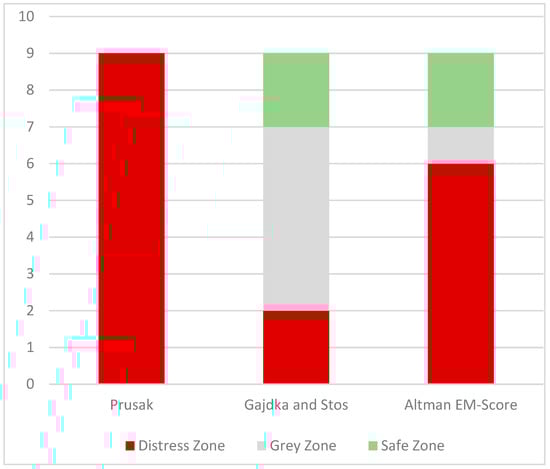 The value of the Z function for the Prusak model for the first half of 2020 indicates a risk of bankruptcy (distress zone) for all companies. According to the Gajdka and Stos model, only CFI Holdings was in a good financial situation. Using Altman’s EM-score, CFI Holdings can also be considered safe. It also indicates that Interferie SA was in a good financial situation. Figure 2 presents the number of enterprises in each classification, according to the different models.