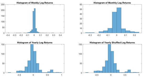 USBAAC log-returns histograms. Weekly, monthly and yearly sampling generates different distributions. In terms of distributions, there is no difference between shuffled and not shuffled yearly log returns.