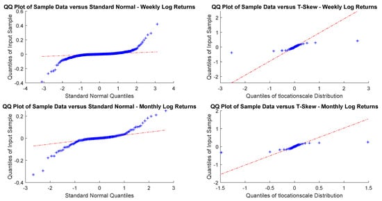 USBAAC weekly and monthly log-returns Q-Q plots. This is the graphic representation of distribution quantiles comparing the CDF of the observed time series, which is unknown, a priori, with that of a specified distribution, chosen as benchmark. If the observed variable follows the theoretical distribution chosen, the Q-Q plot thickens across the line that connects the first and third quantiles of the data.