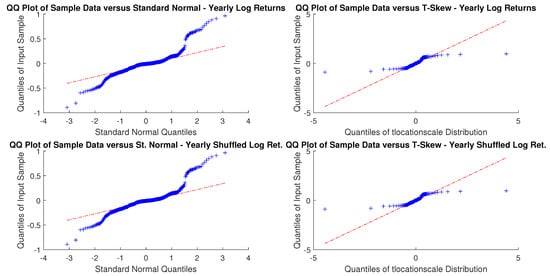 Among the analysis we perform, we mention the moments, the histograms and the so-called quantile-quantile (Q-Q) plot Wilk and Gnanadesikan (1968) where we consider the normal distribution versus the t-skew distribution, etc.