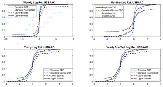 Empirical CDF versus standard normal CDF for USBAAC returns. The dotted black lines represent the DKW upper and lower bounds.