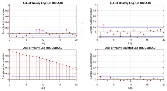 We earlier discussed the interconnectedness between sampling and distributions. We also mentioned that it would be worth to align the time horizon of an investment with sampling as those returns (and their distributions) are those relevant. The problem with yearly returns is that they may be affected by autocorrelation. To this end, one may resolve to the randomly shuffled. Figure 5 shows that, by shuffling the returns, the autocorrelation of yearly data looks similar to the one of weekly and monthly performance. Finally, Table 5 confirms the finding. As mentioned, in Section 3.3.3 the Ljung-Box test could be sensitive to large values of m. This is depicted in Table 5 where the response changes for weekly, monthly and yearly shuffled returns. Anyway, as we set , we do not have this problem.