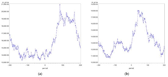 LME nickel prices. The period 0 means the day of the focal episode, i.e., the announcement day. (a) The first focal episode on 10 January 2014; (b) the second focal episode on 8 July 2019. Figures imply that such a big shift in Indonesian government action in response to LME nickel prices represents a significant shock.