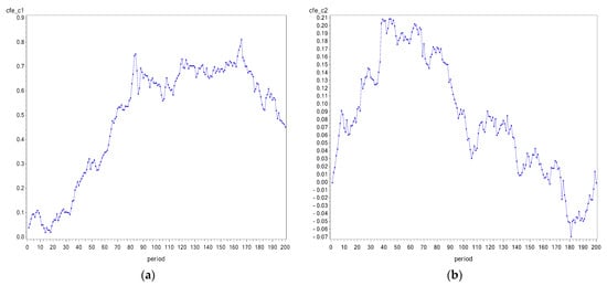 Calculated CFE graph. The actual figures after the focal episode are subtracted by the forecasts via the MLE procedure. (a) The first focal episode on 10 January 2014; (b) the second focal episode on 8 July 2019. Figures imply that the impact of the Indonesian export ban in 2014 is relatively larger than that of in 2019.