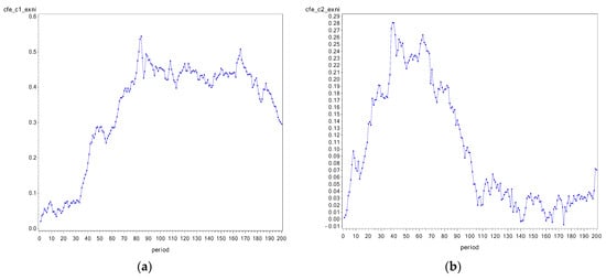 CFE graph for AR; cfe_c1_exni means CFE for AR in 2014 and cfe_c2_exni means CFE for AR in 2019. The actual figures after the focal episode are subtracted from the forecasts via the MLE procedure. (a) The first focal episode on 10 January 2014; (b) the second focal episode on 8 July 2019. Figures imply that the impact of the Indonesian export ban in terms of AR in 2014 is relatively larger than that of in 2019.