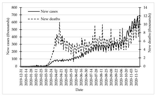 New cases and new deaths of COVID-19 in the period 31 December 2019–26 November 2020. Source: own elaboration on the basis of data from https://ourworldindata.org/coronavirus-source-data (accessed on 15 February 2021).