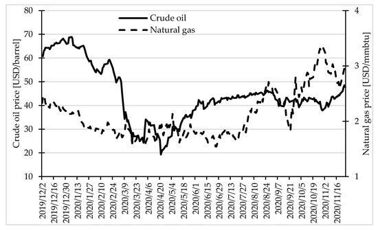 Crude oil and natural gas prices in the period 2 December 2019–26 November 2020. Source: own elaboration on the basis of data from www.stooq.pl (accessed on 18 February 2021).
