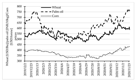 Wheat, palm oil, and corn prices in the period 2 December 2019–26 November 2020. Source: own elaboration on the basis of data from www.stooq.pl (accessed on 18 February 2021).